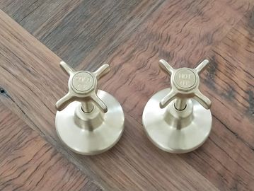 Pair of brushed brass tap handles and splined spindles. Will fit in a standard breech H&C indicators.