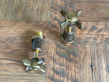 - Raw brass lever handles (washing machine stops)